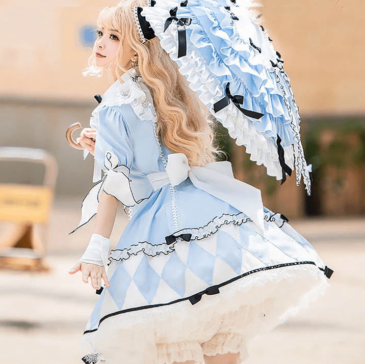The Alice influence extends to coordination and styling choices. Lolita wearers often pair knee-high socks with motifs of clocks or teapots, accessorise with miniature teacup handbags, or wear bonnets decorated with playing cards. This level of thematic immersion transforms outfits into storytelling devices, reflecting the narrative structure of Carroll’s work. Harajuku street style photographs often showcase full Alice-inspired coordinates, emphasising whimsy and surreal proportion, oversized bows, tiered skirts, and exaggerated silhouettes echo the dreamlike distortions of Wonderland.